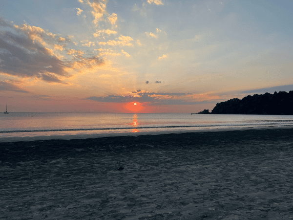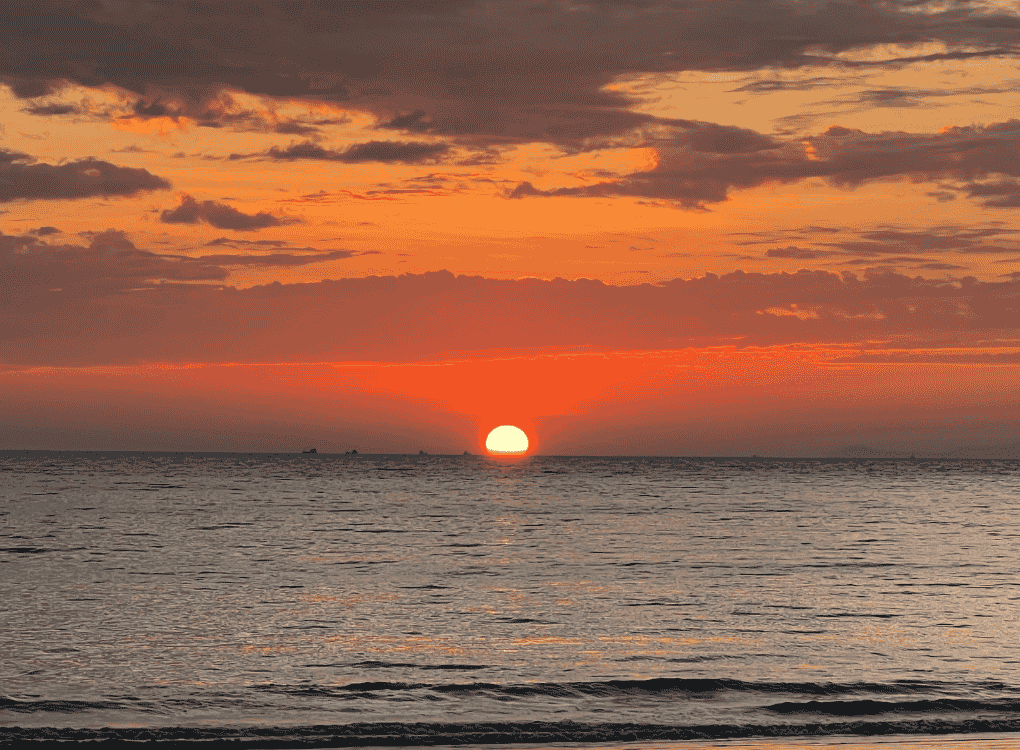 Einer von vielen wunderschönen Sonnenuntergängen. Die Zeit, wenn die Sonne das Meer berührt bis sie darin verschwindet, beträgt 2,5 Minuten. Zu der Zeit sind viele Leute am Strand, spielend, laut, leise, meditieren, laufend.