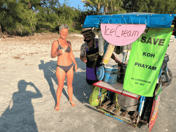 Einmal am Tag kommt der Eismann vorbei, ja direkt an meinem Bungalow. Er hat veganes Kokos-, Schoko-, oder Sweet Potatoe-Eis mit Topping. Sehr lecker.