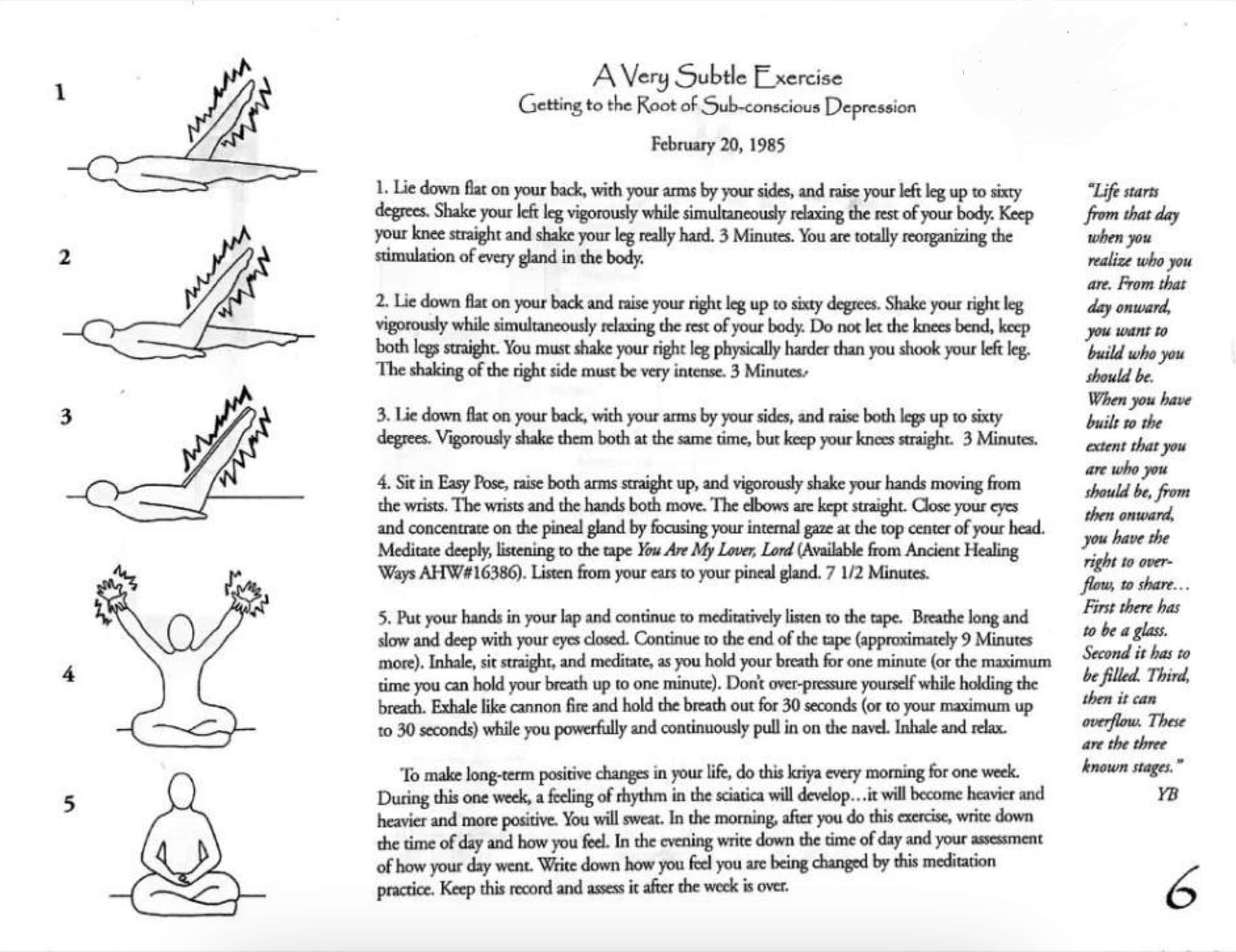 Heute machen wir eine Kundalini Yoga Einheit. Nennt sich auch Kriya. Yogi Badghan hat diese Übungsreihen entwickelt und Übungen so zusammen gestellt, dass sie eine bestimmte Wirkung im Körper-Geist-Seele System hat.