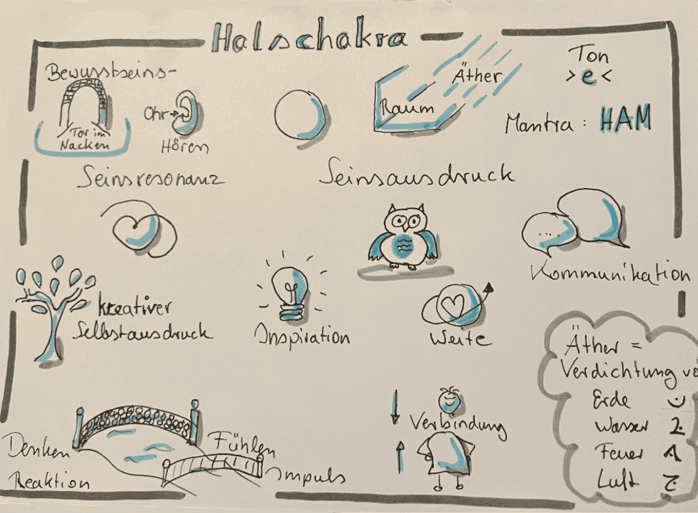Das Halschakra ist der Vermittler aller Chakren an die Außenwelt. Es ist verknüpft mit dem Mentalkörper. Über das Halschakra vollbringt sich die Wahrnehmung der offenen und verborgenen Stimmen: Hinlauschen, die Stille hören.